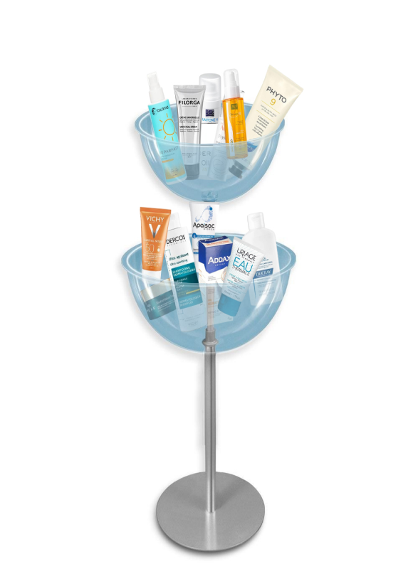 Ce type de présentoir, constitué d’une colonne supportant une demi-sphère, est parfait pour exposer des produits en vrac ou des articles en promotion. Grâce à sa forme unique, il attire l’œil des clients et permet de mettre en avant des petits articles souvent oubliés ou négligés. Ce présentoir est idéal pour les produits bénéficiant de remises spéciales.
